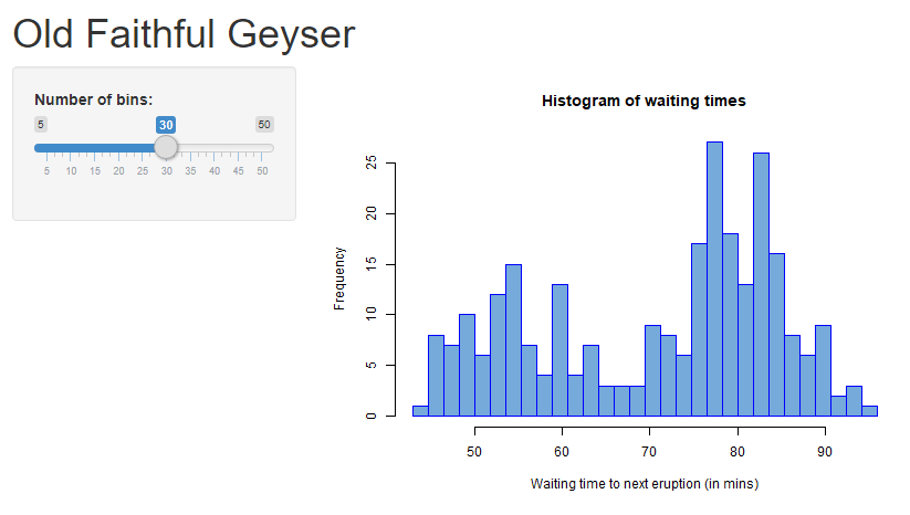 In the ui.R file you set up how the app looks to the user. You can also designate place for the user to interact with. The way Shiny organizes the application layout is through panels. Inside the Panels, you can place widgets for input from the user and the reactive output that follows. These panels and layout functions are nested within each other to create the layout of your app. As with most things in R, it is completely customizable. Some common layout functions that are used are as follows: