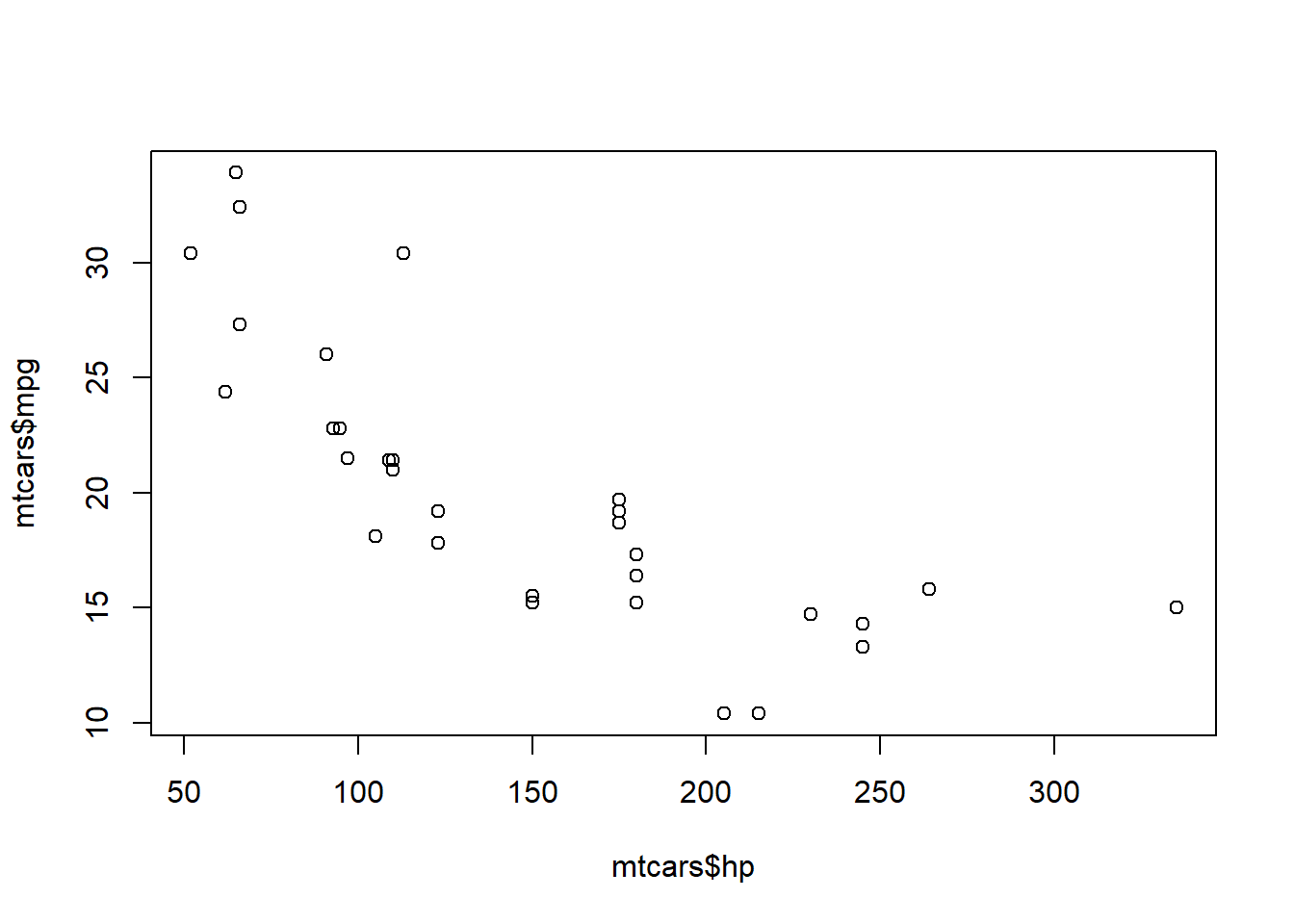 To get a correlation in R, use the cor() function. This function requires two arguments, the two variables you want to compare. It also helps to create a scatterplot so you can visualize what is going on. In this example, while not a perfect line, there appears to be a negative relationship between a car’s miles per gallon and its horsepower. So as the horsepower increases, the miles per gallon decreases.